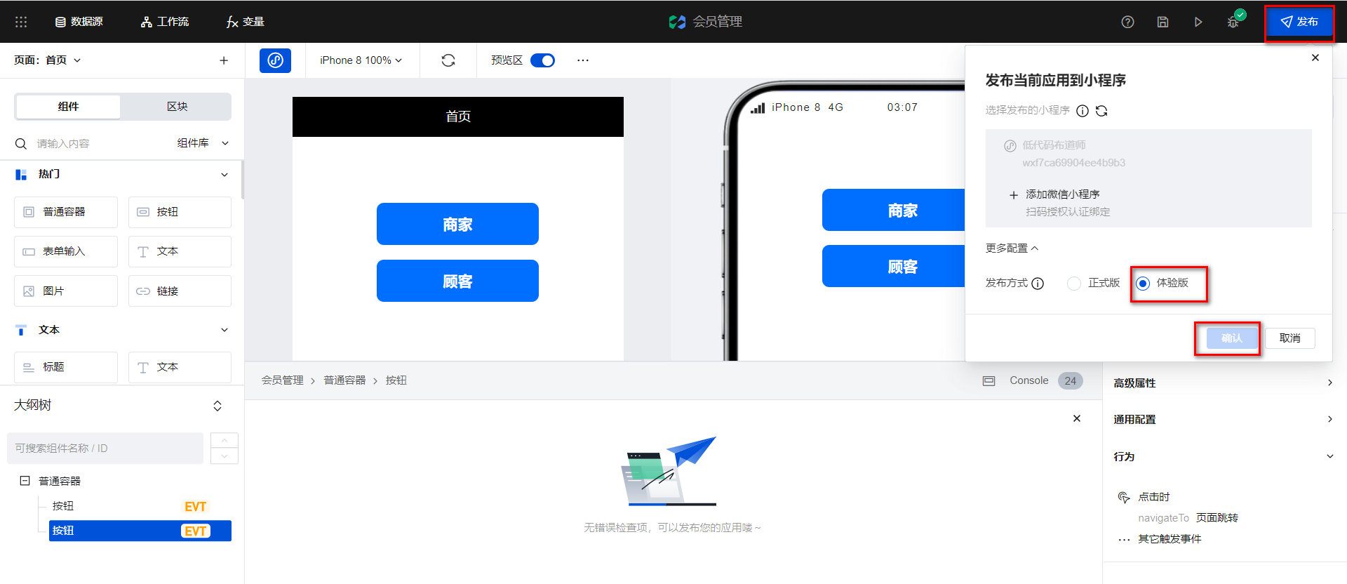 按钮文本内容修改好之后我们可以给按钮添加行为,设置为点击后跳转到页面。为了设置目标页面我们可以先创建两个页面,商家端的首页和顾客端的首页。点击左上角的+号创建新页面,输入页面名称和标识。  页面创建好之后我们就可以设置点击事件了。选中按钮组件,在右侧的属性面板找到行为。点击点击时 ,在弹出的界面选择页面跳转,设置跳转的页面即可
