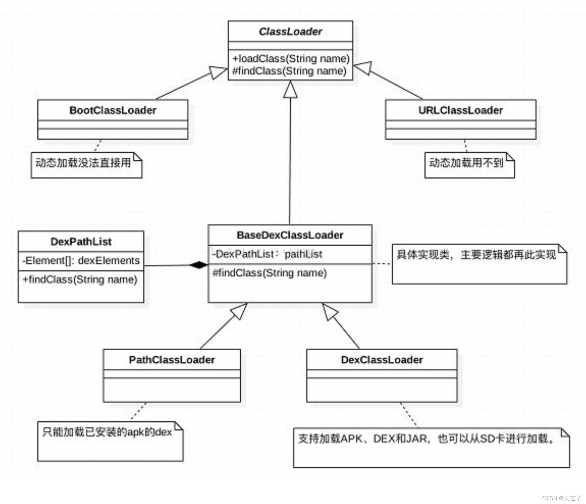 - BaseDexClassLoader:PathClassaLoader、DexClassLoader父类