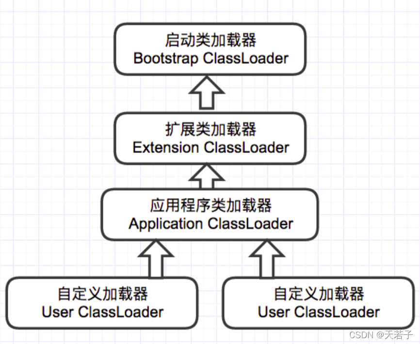 某个特定的类加载器在接到加载类的请求时,首先将加载任务委托给父类加载器,每一层的加载器都采用这种方式,直到委托给顶层的启动类加载器为止,如果超类无法加载该类,则会将类的加载内容退回给它的下一层。