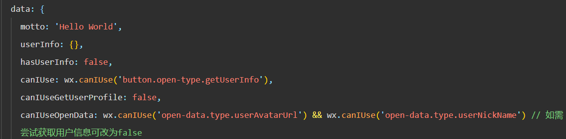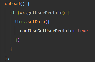 在该页面打开时,通过设置生命周期函数,会判断能否使用wx.getUserProfile函数调用信息,并返回相应布尔值到参数canIUseGetUserProflie