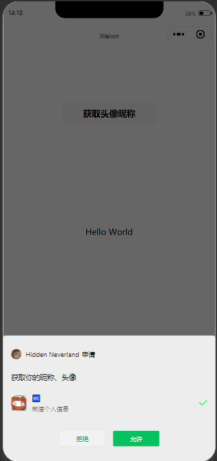 实际上实例代码中给出了两种函数:wx.getUserProfile和wx.getUserInfo,在初次进入界面时会显示弹窗,获取用户授权。