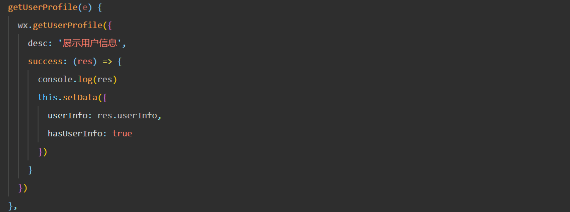 参数被置为True后,则会显示按钮获取用户授权,用户的选择与参数hasUserInfo绑定。由此运行在js中绑定的getUserProfile函数。