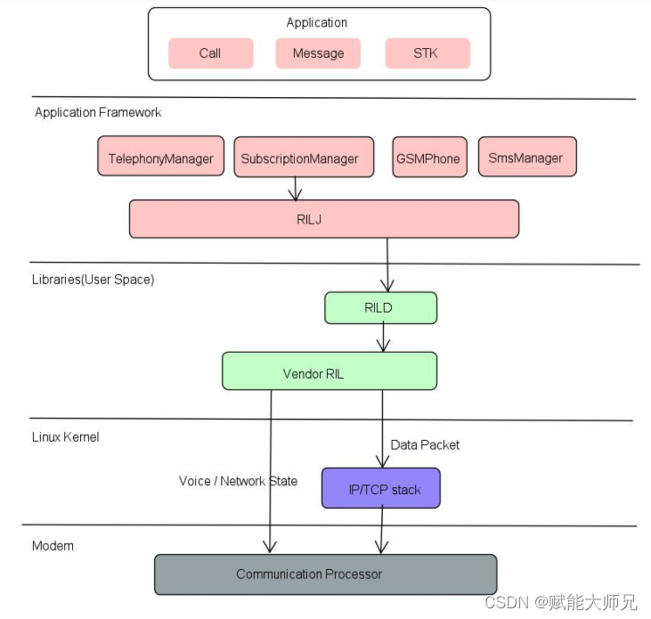 - Linux驱动层:kernel驱动层接受到数据后,将指令传给CP,最后由CP发送给网络端,等网络返回结果后,CP将传回给RILD;