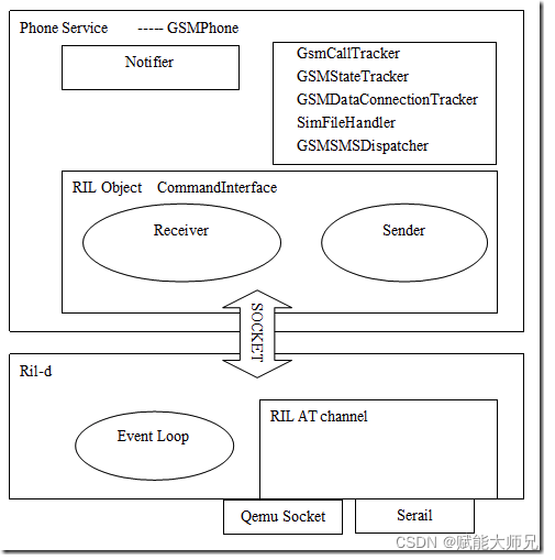以上三个 Tracker 对象负责与 RIL 类的 Java 对象进行交互,而这些交互在 RIL 层中的处理是与 Modem 基于串口连接的AT命令的发送和执行,最终完成语音通话、网络服务状态和网络数据连接的控制和管理。