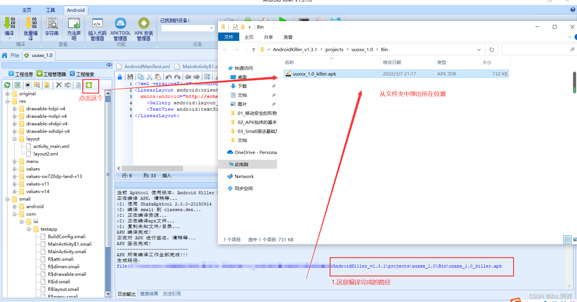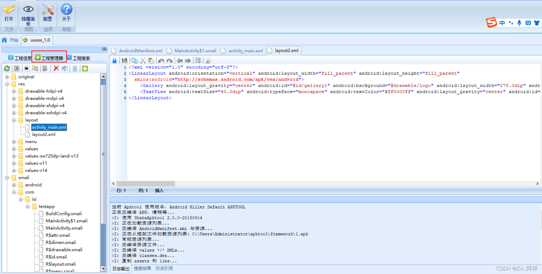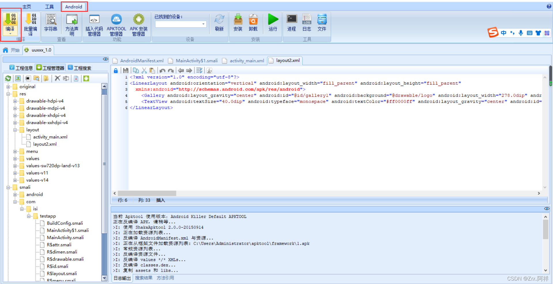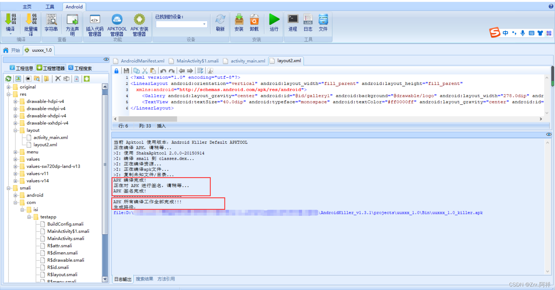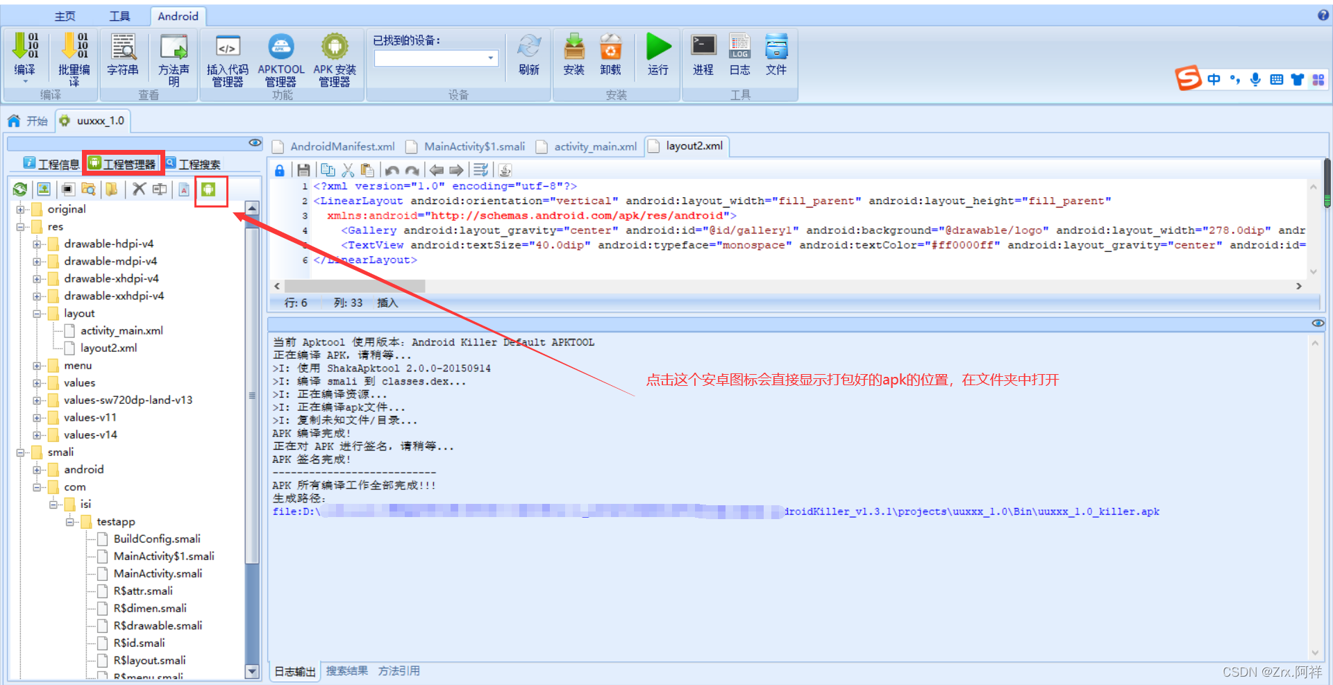 ?4.把上面反编译完成的app,再次打包成为apk文件,点击工具-编译。慢慢等待编译完成即可,编译完成会显示编译成功的apk的路径。或者实在是懒得找可以直接点击:工程管理器-安卓图标
