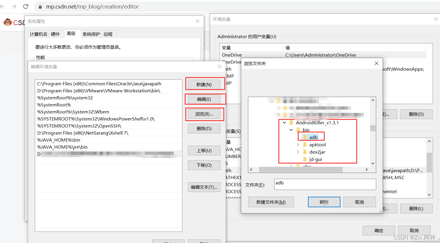 ? ? ? ? 把adb添加到环境变量的的path中,我的电脑右键-属性-高级系统设置-环境变量-系统变量-新建-编辑-浏览-选择自己的Androidkiller的bin目录下的adb文件夹就好-全部确认。这时候打开cmd输入adb version验证是否成功