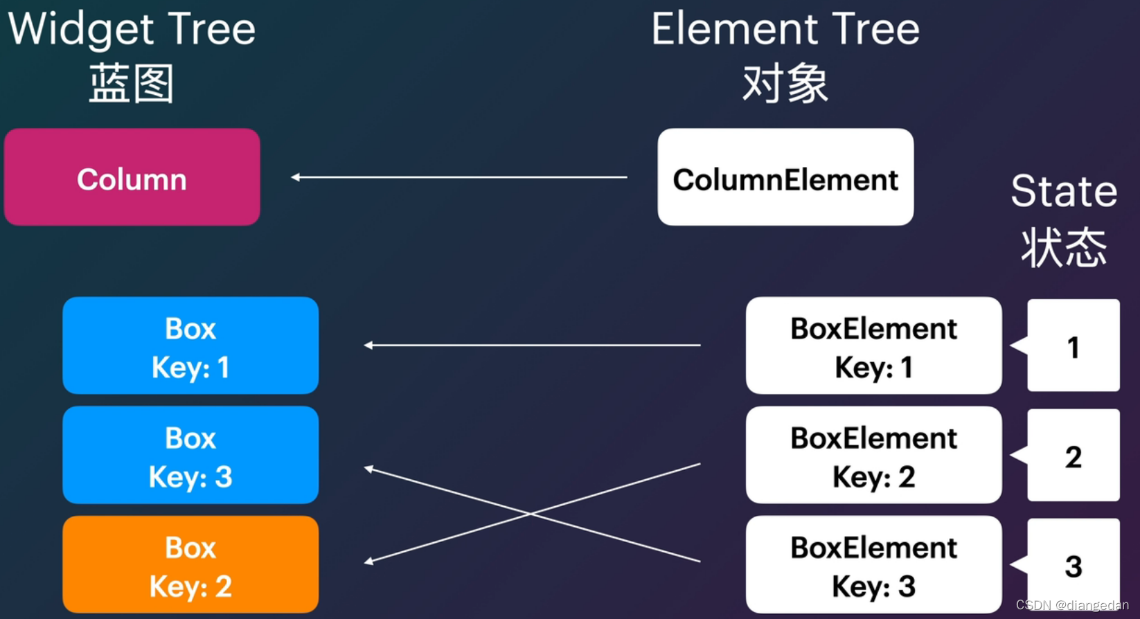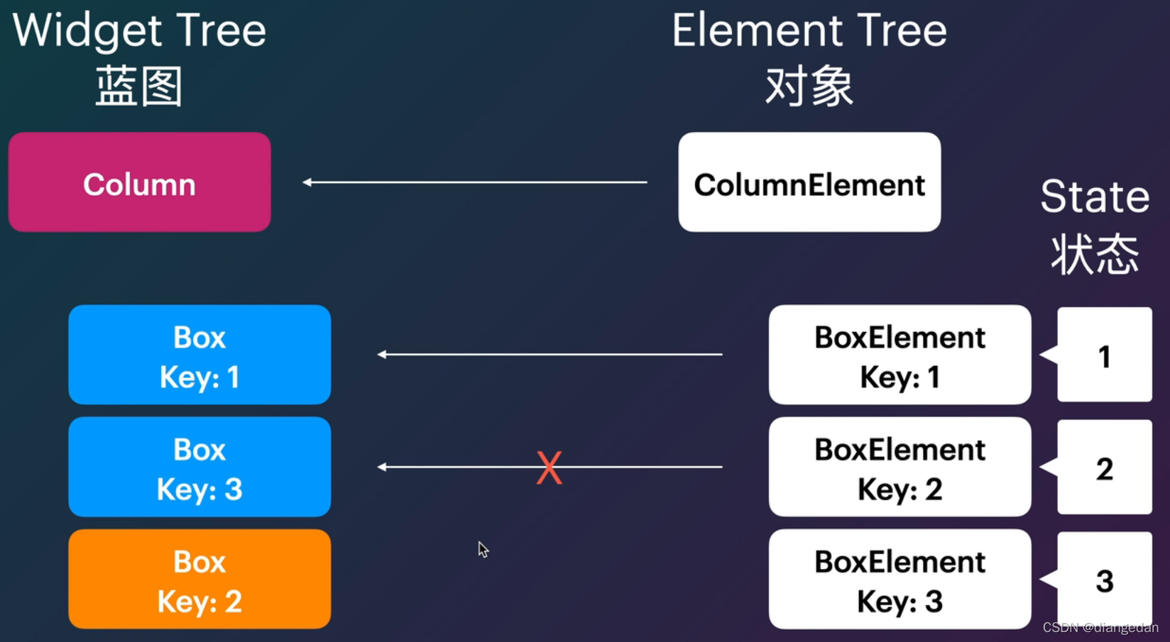 当你有一系列的 Widget 使用的是同样的类; 不给Flutter 传 Key的话,Flutter 有时候就会分不清楚他们的对应关系。尤其是widget 顺序发生改变的时候。这个是就需要我们通过 Key 来标识 Widget