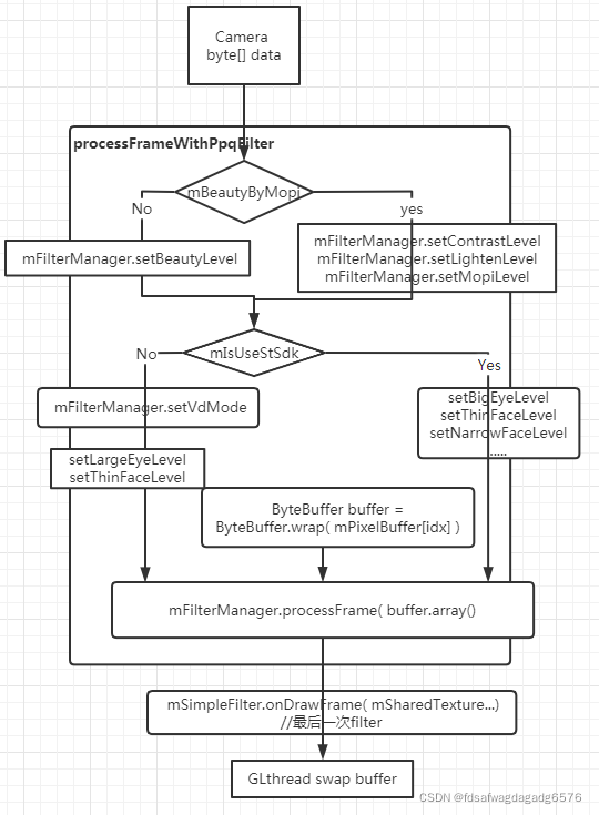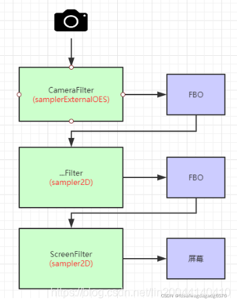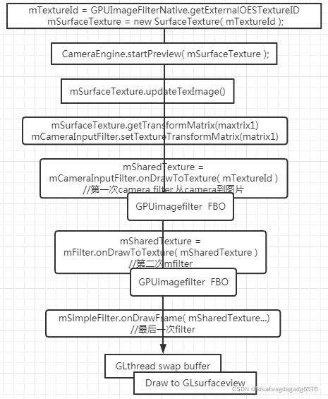Camera通过surfaceTexture采集图片,经过3个filter处理,输出到shareContext SurfaceTexture.updateTexImage()将camera采集的图片传入opengl 纹理 第一个filter:camera filter 第一次filter:CameraInputFilter外部纹理getExternalOESTextureID转成本地2D纹理 第二个filter:打开fbo:mFilter添加背景滤镜.第二个filter开始,使用share context,mSharedTexture? 第三个filter:关闭fbo. mSimpleFilter 输出到shareContext?