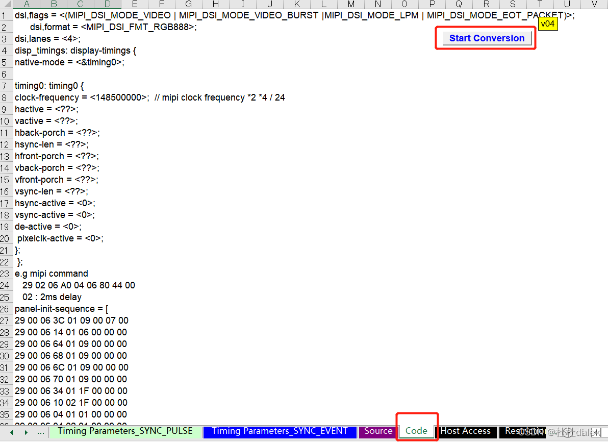 ?选择code,点击start?conversion,得到初始化序列。