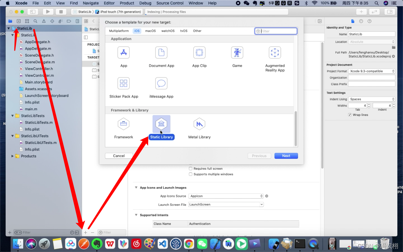 在项目里面创建一个静态库  给静态库命名一下,命名不能跟项目命名重复   看下面图片,假如我们把静态库的文件已经写好了。  写好之后我们在项目里面的viewController 导入头文件去使用他,这时候我们可以在静态库文件里面断点,对静态库可以进行调试。