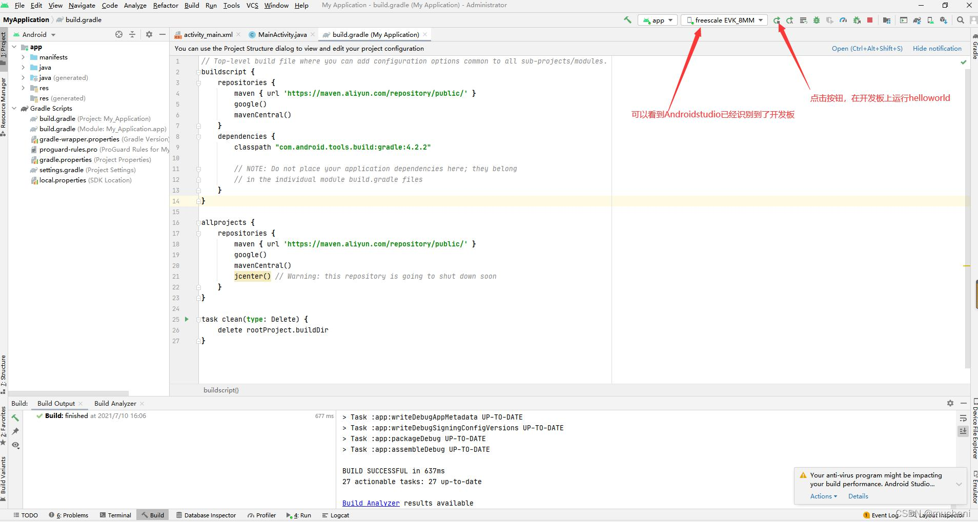 30.2 在开发板上运行 在开发板上运行 APP 程序之前,要准备做好以下工作: ? 在硬件方面,开发板的电源线,调试串口线,OTG 烧写线,屏幕要连接好。 ? 在软件方面,windows 系统要安装好 PL2303 驱动和 adb 驱动,开发板要烧写?Android?系统。并且开发板要参考第二十章 使用 ADB 命令传递文件到 Android 设备“允许 usb 调试”章节进行设置。 1 打开上次创建的 MyApplication 工程,在红框那里我们可以看到开发板已经被识别到了,注意!!!一定要按照第二十章 使用 ADB 命令传递文件到 Android 设备章节进行设置,否则会识别不到开发板。点击箭头所指的绿色三角形,项目开始运行,稍微等待一会,安装成功,如下图所示: