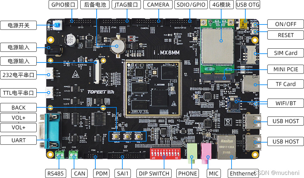 底板参数 尺寸:? ? ? ? 190mm*125mm? ? ? ? UART:? ? ? ? 1路232串口 POWER:? ? ? ? 直流电源输入接口,12V5A电源输入? ? ? ? TTL-UART:? ? ? ? 1路 SWITCH:? ? ? ? 电源开关? ? ? ? 232-UART:? ? ? ? 1路 PDM接口:? ? ? ? 8路, 最大支持4线8通道 (2mm间距10PIN插座引出)? ? ? ? SAI:? ? ? ? 支持5路SAI接口(2mm间距26PIN插座引出) DIP: SWITCH? ? ? ? 1个10位拨码开关? ? ? ? MIC:? ? ? ? 支持MIC输入 Ethernet:? ? ? ? 1 路千兆工业级以太网,RJ45 接口? ? ? ? PHONE:? ? ? ? 支持耳机输出 USB?HOST:? ? ? ? 2路USB2.0,带有集成PHY? ? ? ? RS485:? ? ? ? 1路 WIFI/BT:? ? ? ? 支持? ? ? ? CAN:? ? ? ? 1路 MINI PCIE:? ? ? ? 可外接mini PCIE接口的4G模块,具备PCIE2.0单通道? ? ? ? Speaker:? ? ? ? 2路 4G模块:? ? ? ? 支持(选配模块,需要请联系客服)? ? ? ? SDIO/GPIO接口:? ? ? ? 20PIN USB OTG? ? ? ? 1路标准micro USB插座,USB2.0 OTG? ? ? ? JTAG接口:? ? ? ? 1路(2mm间距20PIN插座引出) CAMERA接口:? ? ? ? 1个MIPI CSI(4通道),带PHY? ? ? ? GPIO接口:? ? ? ? 20PIN(2mm间距20PIN插座引出) MIPI-DSI:? ? ? ? 1路 4通道? ? ? ? TF Card??:? ? ? ? 1个 SIM Card:? ? ? ? 1个? ? ? ? RTC:? ? ? ? 实时时钟 按键:? ? ? ? 5个? ? ? ? I2C:? ? ? ? 2路(2mm间距26PIN插座引出)
