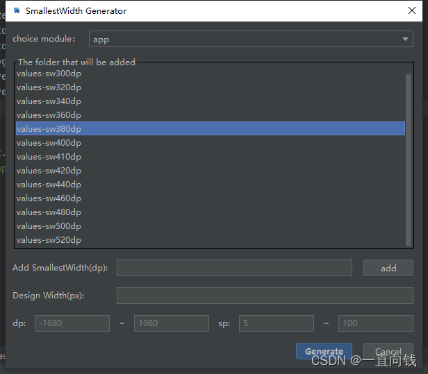 ?插件启动后可自主选择要在那个moudel下生成values-sw<N>dp文件夹,默认有一些文件夹,你也可以通过Add smallestWidth添加需要的尺寸。Design Width 为你设计稿的尺寸是必填项,我在这里填写最小单位360。