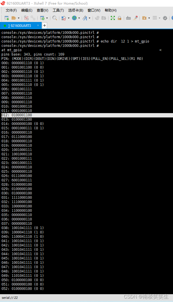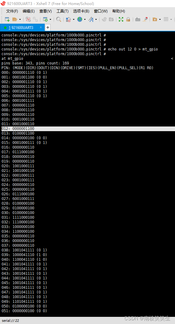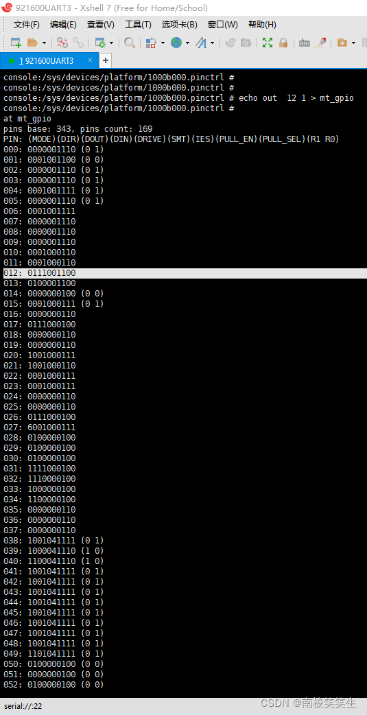 配置GPIO12为GPIO引脚: console:/sys/devices/platform/1000b000.pinctrl #? console:/sys/devices/platform/1000b000.pinctrl # echo mode 12 0 > mt_gpio console:/sys/devices/platform/1000b000.pinctrl # cat mt_gpio ? ? ? ? ? ? ? ? ? ? ? ? ? ? ? ? ? ? ? ? ? ? ? ? ? ? ? ? ? ? ? ? ? ?< pins base: 343, pins count: 169 PIN: (MODE)(DIR)(DOUT)(DIN)(DRIVE)(SMT)(IES)(PULL_EN)(PULL_SEL)(R1 R0) 000: 0000001110 (0 1) 001: 0001001100 (0 0) 002: 0000001110 (0 1) 003: 0000001110 (0 1) 004: 0001001111 (0 1) 005: 0000001110 (0 1) 006: 0001001111 007: 0000001110 008: 0000001110 009: 0000001110 010: 0001000110 011: 0001000110 012: 0100001100 013: 0100001100