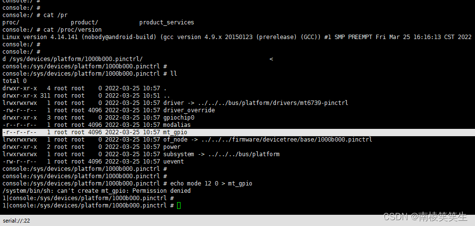 console:/ #? console:/ # input keyevent 82 ? ? ? ? ? ? ? ? ? ? ? ? ? ? ? ? ? ? ? ? ? ? ? ? ? console:/ #? console:/ #? console:/ # time ? ? 0m03.35s user ? ? 0m03.28s system console:/ #? console:/ # date Fri Mar 25 10:55:13 GMT 2022 console:/ #? console:/ #? console:/ # ll total 148 drwxr-xr-x ?21 root ? root ? ?4096 2022-03-25 10:25 . drwxr-xr-x ?21 root ? root ? ?4096 2022-03-25 10:25 .. dr-xr-xr-x ?48 root ? root ? ? ? 0 2022-03-25 10:51 acct drwxr-xr-x ?14 root ? root ? ? 280 2022-03-25 10:52 apex lrw-r--r-- ? 1 root ? root ? ? ?11 2022-03-25 10:25 bin -> /system/bin lrw-r--r-- ? 1 root ? root ? ? ?50 2022-03-25 10:25 bugreports -> /data/user_de/0/com.android.shell/files/bugreports drwxrwx--- ? 6 system cache ? 4096 2019-01-01 00:00 cache lrw-r--r-- ? 1 root ? root ? ? ?19 2022-03-25 10:25 charger -> /system/bin/charger drwxr-xr-x ? 4 root ? root ? ? ? 0 1970-01-01 00:00 config lrw-r--r-- ? 1 root ? root ? ? ?17 2022-03-25 10:25 d -> /sys/kernel/debug drwxrwx--x ?55 system system ?4096 2022-03-25 10:53 data drwxr-xr-x ? 2 root ? root ? ?4096 2022-03-25 08:00 debug_ramdisk lrw------- ? 1 root ? root ? ? ?23 2022-03-25 10:25 default.prop -> system/etc/prop.default drwxr-xr-x ?21 root ? root ? ?4300 2022-03-25 10:52 dev lrw-r--r-- ? 1 root ? root ? ? ?11 2022-03-25 10:25 etc -> /system/etc lrwxr-x--- ? 1 root ? shell ? ? 16 2022-03-25 10:25 init -> /system/bin/init -rwxr-x--- ? 1 root ? shell ? 2255 2022-03-25 08:00 init.environ.rc -rwxr-x--- ? 1 root ? shell ? ? 62 2022-03-25 10:10 init.preload.rc -rwxr-x--- ? 1 root ? shell ?33397 2022-03-25 10:14 init.rc -rwxr-x--- ? 1 root ? shell ? 7690 2022-03-25 09:31 init.usb.configfs.rc -rwxr-x--- ? 1 root ? shell ? 5649 2022-03-25 09:31 init.usb.rc -rwxr-x--- ? 1 root ? shell ? ?563 2022-03-25 09:31 init.zygote32.rc drwx------ ? 2 root ? root ? 16384 2022-03-25 10:25 lost+found drwxr-xr-x ? 7 root ? root ? ?4096 2019-01-01 00:00 metadata drwxr-xr-x ?13 root ? system ? 280 2022-03-25 10:52 mnt drwxr-xr-x ? 2 root ? root ? ?4096 2022-03-25 08:00 odm drwxr-xr-x ? 2 root ? root ? ?4096 2022-03-25 08:00 oem dr-xr-xr-x 398 root ? root ? ? ? 0 1970-01-01 00:00 proc drwxr-xr-x ? 8 root ? root ? ?4096 2022-03-25 10:23 product lrw-r--r-- ? 1 root ? root ? ? ?24 2022-03-25 10:25 product_services -> /system/product_services drwxr-x--- ? 2 root ? shell ? 4096 2022-03-25 08:00 sbin lrw-r--r-- ? 1 root ? root ? ? ?21 2022-03-25 10:25 sdcard -> /storage/self/primary drwxr-xr-x ? 4 root ? root ? ? 100 2022-03-25 10:53 storage dr-xr-xr-x ?16 root ? root ? ? ? 0 2022-03-25 10:51 sys drwxr-xr-x ?13 root ? root ? ?4096 2022-03-25 10:25 system -rw-r--r-- ? 1 root ? root ? ?2880 2022-03-25 08:00 ueventd.rc drwxr-xr-x ?12 root ? root ? ?4096 2022-03-25 10:13 vendor -rw-r--r-- ? 1 root ? root ? ? 524 2022-03-25 10:14 verity_key console:/ #? console:/ #? console:/ # cat /pr proc/ ? ? ? ? ? ? ? product/ ? ? ? ? ? ?product_services console:/ # cat /proc/version ? ? ? ? ? ? ? ? ? ? ? ? ? ? ? ? ? ? ? ? ? ? ? ? ? Linux version 4.14.141 (nobody@android-build) (gcc version 4.9.x 20150123 (prerelease) (GCC)) #1 SMP PREEMPT Fri Mar 25 16:16:13 CST 2022 console:/ #? console:/ # cd /sys/devices/platform/1000b000.pinctrl/ ? ? ? ? ? ? ? ? ? ? ? ? ? ? ? ? ? ? < console:/sys/devices/platform/1000b000.pinctrl #? console:/sys/devices/platform/1000b000.pinctrl # ll total 0 drwxr-xr-x ? 4 root root ? ?0 2022-03-25 10:57 . drwxr-xr-x 311 root root ? ?0 2022-03-25 10:51 .. lrwxrwxrwx ? 1 root root ? ?0 2022-03-25 10:57 driver -> ../../../bus/platform/drivers/mt6739-pinctrl -rw-r--r-- ? 1 root root 4096 2022-03-25 10:57 driver_override drwxr-xr-x ? 3 root root ? ?0 2022-03-25 10:57 gpiochip0 -r--r--r-- ? 1 root root 4096 2022-03-25 10:57 modalias -r--r--r-- ? 1 root root 4096 2022-03-25 10:57 mt_gpio lrwxrwxrwx ? 1 root root ? ?0 2022-03-25 10:57 of_node -> ../../../firmware/devicetree/base/1000b000.pinctrl drwxr-xr-x ? 2 root root ? ?0 2022-03-25 10:57 power lrwxrwxrwx ? 1 root root ? ?0 2022-03-25 10:57 subsystem -> ../../../bus/platform -rw-r--r-- ? 1 root root 4096 2022-03-25 10:57 uevent console:/sys/devices/platform/1000b000.pinctrl #? console:/sys/devices/platform/1000b000.pinctrl #? console:/sys/devices/platform/1000b000.pinctrl # echo mode 12 0 > mt_gpio /system/bin/sh: can't create mt_gpio: Permission denied 1|console:/sys/devices/platform/1000b000.pinctrl # chmod 777 mt_gpio ? ? ? ? ? ? ? ? ? ? ? ? ? ? ? ? ? ? ? ? ? ? ? ? ? ? ? ? ? ? ?< console:/sys/devices/platform/1000b000.pinctrl #? console:/sys/devices/platform/1000b000.pinctrl # ll total 0 drwxr-xr-x ? 4 root root ? ?0 2022-03-25 10:57 . drwxr-xr-x 311 root root ? ?0 2022-03-25 10:51 .. lrwxrwxrwx ? 1 root root ? ?0 2022-03-25 10:57 driver -> ../../../bus/platform/drivers/mt6739-pinctrl -rw-r--r-- ? 1 root root 4096 2022-03-25 10:57 driver_override drwxr-xr-x ? 3 root root ? ?0 2022-03-25 10:57 gpiochip0 -r--r--r-- ? 1 root root 4096 2022-03-25 10:57 modalias -rwxrwxrwx ? 1 root root 4096 2022-03-25 10:59 mt_gpio lrwxrwxrwx ? 1 root root ? ?0 2022-03-25 10:57 of_node -> ../../../firmware/devicetree/base/1000b000.pinctrl drwxr-xr-x ? 2 root root ? ?0 2022-03-25 10:57 power lrwxrwxrwx ? 1 root root ? ?0 2022-03-25 10:57 subsystem -> ../../../bus/platform -rw-r--r-- ? 1 root root 4096 2022-03-25 10:57 uevent console:/sys/devices/platform/1000b000.pinctrl #? console:/sys/devices/platform/1000b000.pinctrl # cat mt_gpio ? ? ? ? ? ? ? ? ? ? ? ? ? ? ? ? ? ? ? ? ? ? ? ? ? ? ? ? ? ? ? ? ? ?< pins base: 343, pins count: 169 PIN: (MODE)(DIR)(DOUT)(DIN)(DRIVE)(SMT)(IES)(PULL_EN)(PULL_SEL)(R1 R0) 000: 0000001110 (0 1) 001: 0001001100 (0 0) 002: 0000001110 (0 1) 003: 0000001110 (0 1) 004: 0001001111 (0 1) 005: 0000001110 (0 1) 006: 0001001111 007: 0000001110 008: 0000001110 009: 0000001110 010: 0001000110 011: 0001000110 012: 0100001100 013: 0100001100