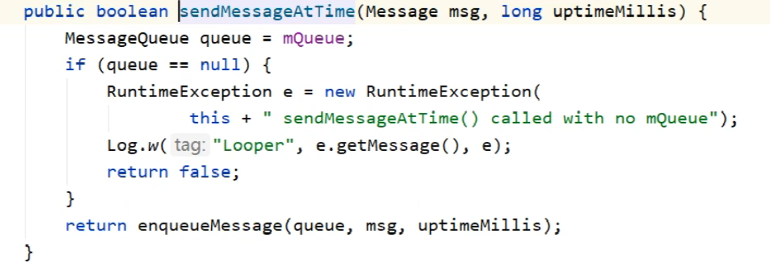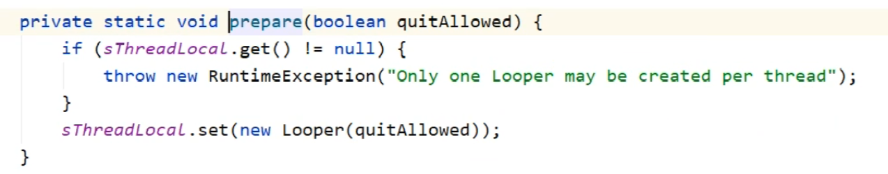 首先looper.prepare()方法会判断是否只有一个looper 如果有多个会报错 ,然后构建出一个looper  怎么保证一个线程只持有一个looper?  每个Thread对象持有一个ThreadLocalMap对象(很像hashMap) 再看上面sThreadLocal.set方法 直接获取ThreadLocalMap对象 进行存放 key是线程 value是looper。这也解释了上面通过sThreadLocal.get()方法去进行是否looper已存在的判断。