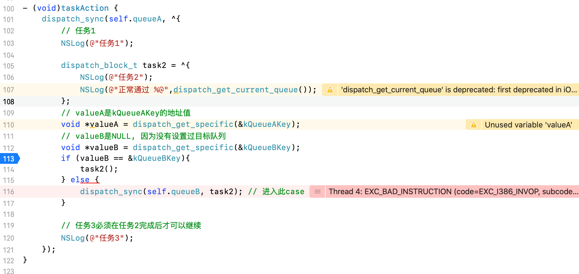 dispatch_sync(self.queueB, task2); // 实际运行,进入此case