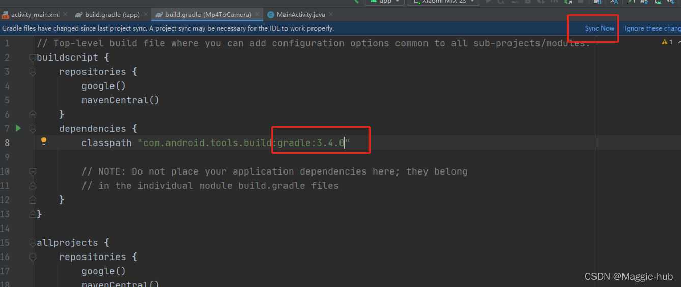 到项目级build.gradle中修改gradle的版本为3.4.0: