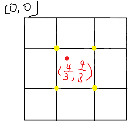 - 又因为 (4/3, 4/3) 的点距离 (1, 1) 点更近,所以受到 (1, 1) 点的值影响更大一点