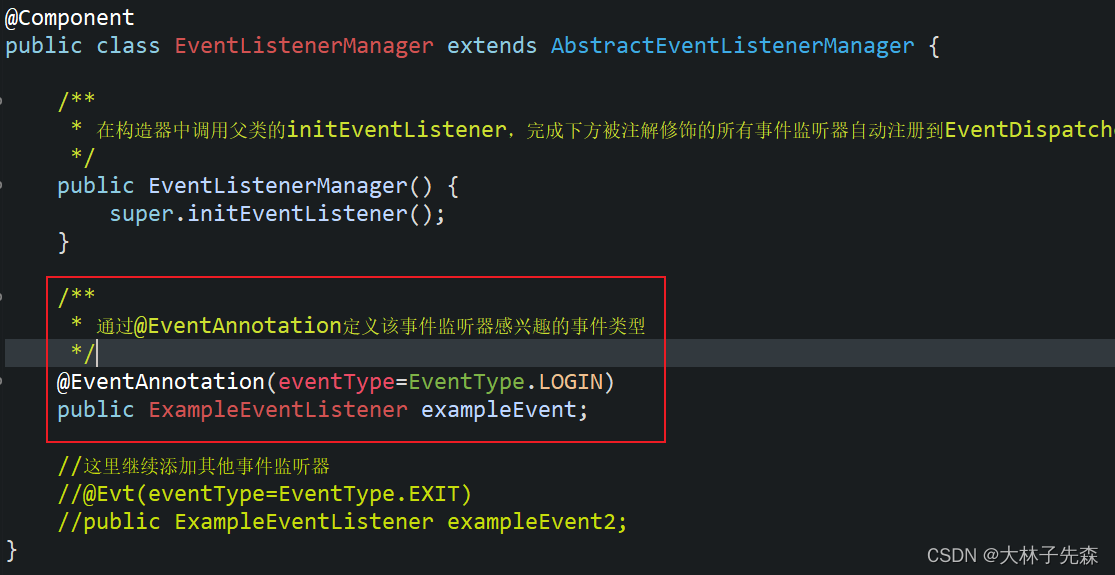 * 在构造器中调用父类的initEventListener,完成下方被注解修饰的所有事件监听器自动注册到EventDispatcher