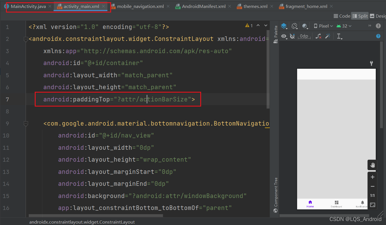 android:theme="@style/Theme.BottomNavigationApp"> <!-- 进入这个主题中修改 -->