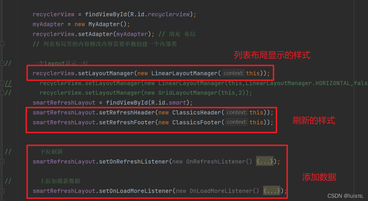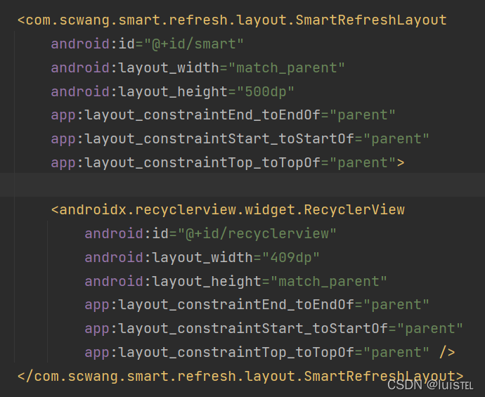 1、在activity_main中将RecylerView嵌入SmartRefreshLayout(智能刷新布局)
