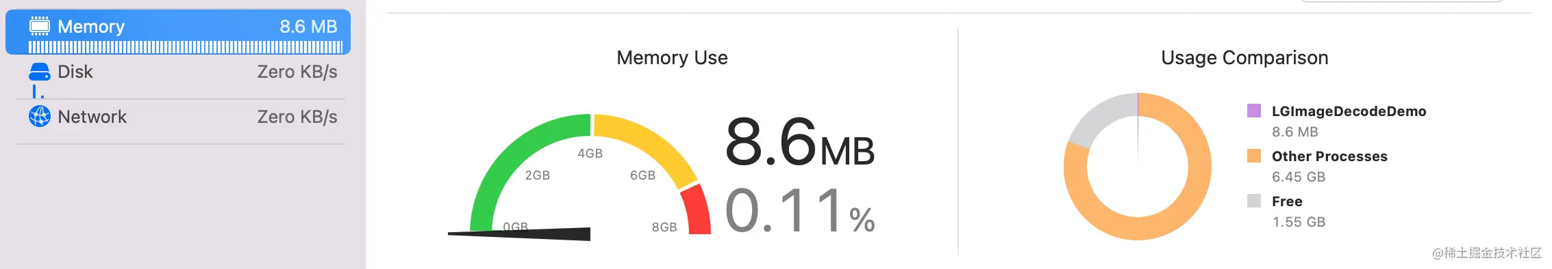 运行项目,查看占用内存情况。