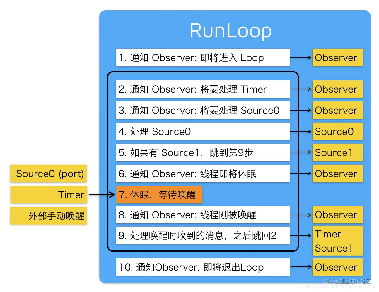 用什么来监测卡顿呢,我们这里用到RunLoop。我们知道RunLoop是主运行循环,可以保存任务的生命周期。(60FPS=16.67ms=1/60)