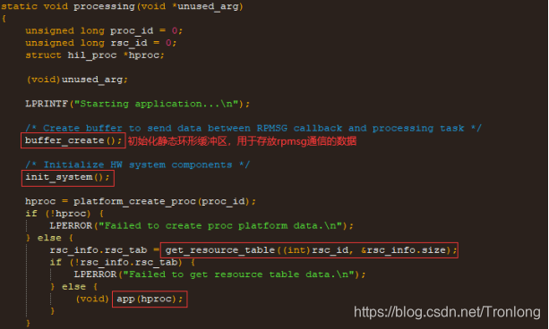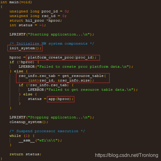 - 在main()中调用init_system()初始化libmetal库与GIC控制器等。调用platform_create_proc()创建平台相关信息。调用get_resource_table()获取资源表信息。以上函数调用成功后,再调用app()。