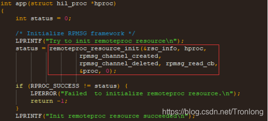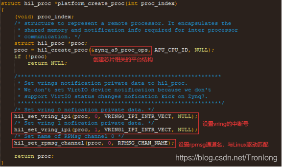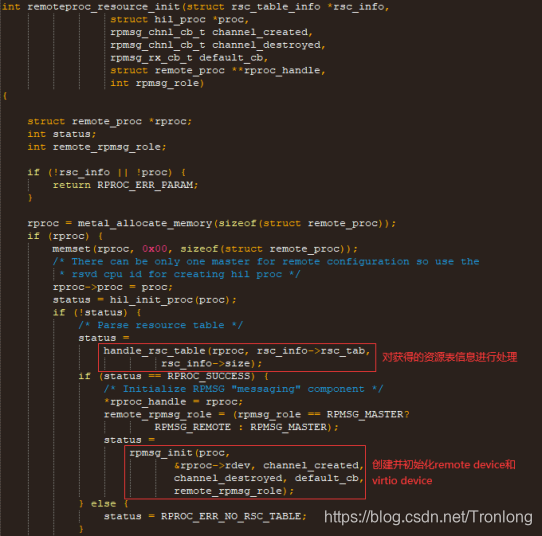 调用remoteproc_resource_init()对之前获得的平台信息、资源表信息进行处理。创建Remote Device,并为其设置增加、删除、读取RPMsg通道函数。