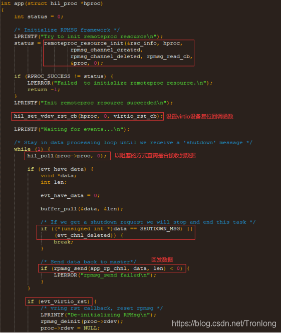 在virtio设备复位函数virtio_rst_cb()中产生复位virtio事件,并在app()中进行事件处理。