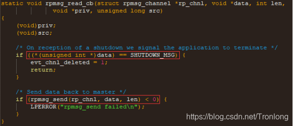 在数据读取函数rpmsg_read_cb()中,对从CPU0接收到的数据进行判断,并进行不同处理(关机或回传数据),实现通信和生命周期管理。