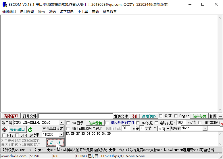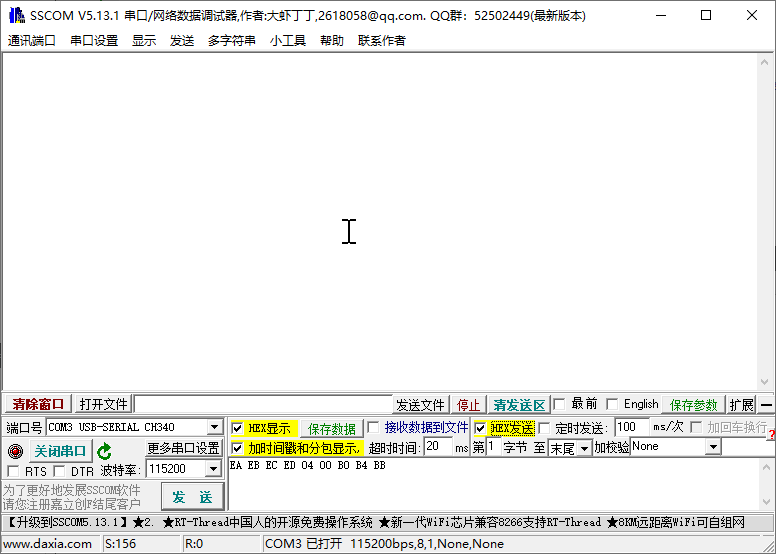 然后一边找客服解答一边写了串口代码测试发现有回复,然后尝试勾选了Hex发送、Hex显示、加时间戳和分包显示后正常了,这个就尴尬了,当指令为16进制时需要注意你的串口测试工具是否开启了16进制,否则发送的指令很有可能没有回复: