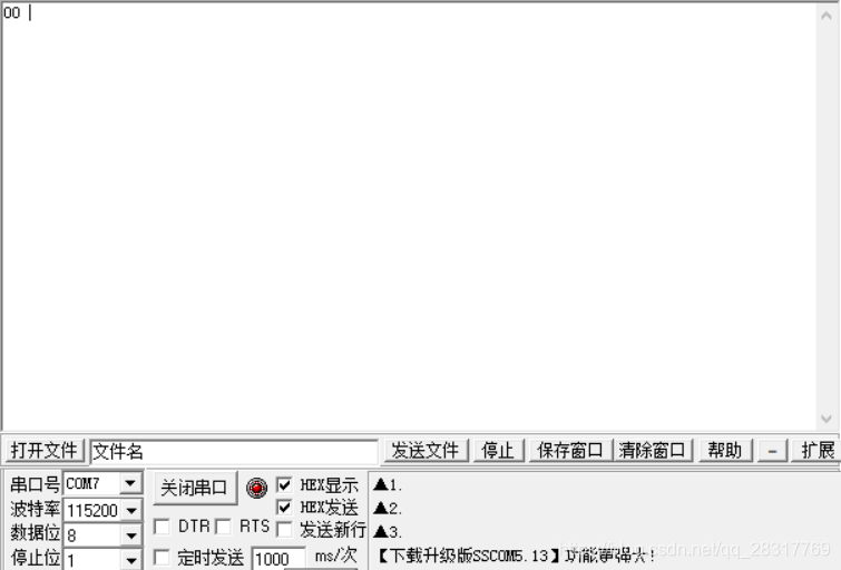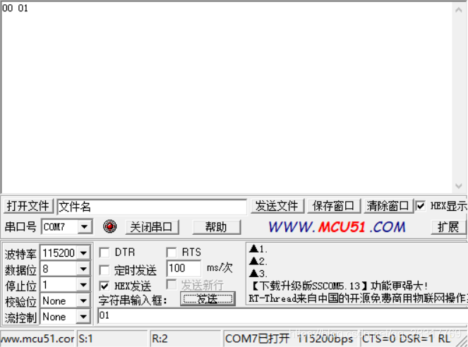 在串口中,发送0x01后,串口助手会接收到返回值0x01,如下图;