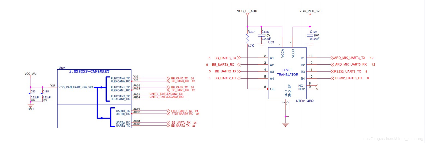i.MX8QXP MEK 板默认的调试串口设计如下:从 UART0_TX/RX 3.3V 管脚,经过一个带开关功能的电平转换器(没有做电平转换),然后连接到 UART to USB 桥上。