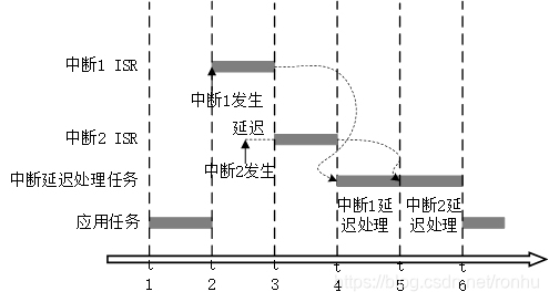 当中断服务程序需要完成的处理较多时,操作系统提供了延迟中断处理的机制。操作系统管理一个用于延迟中断处理的任务,其优先级高于所有的任务,但低于所有的中断。从应用程序的角度看,中断服务程序和延迟中断处理是连续执行的,没有被打断;但从中断服务程序的角度看,耗时的处理被延迟到了一个任务当中,从而对其它外设中断处理的延迟可以达到最小化。图 1?1是一个使用中断延迟处理的执行序列的例子。