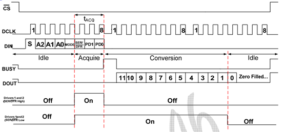 位序号 | 名称 | 0 | 起始位:S | 1 | 地址位:A2 | 2 | 地址位:A1 | 3 | 地址位:A0 | 4 | 模式选择位:MODE | 5 | 控制参考源位:SER=1/DFR=0 | 6 | 掉电和内部参考电压配置位:PD1 | 7 | 掉电和内部参考电压配置位:PD0 |