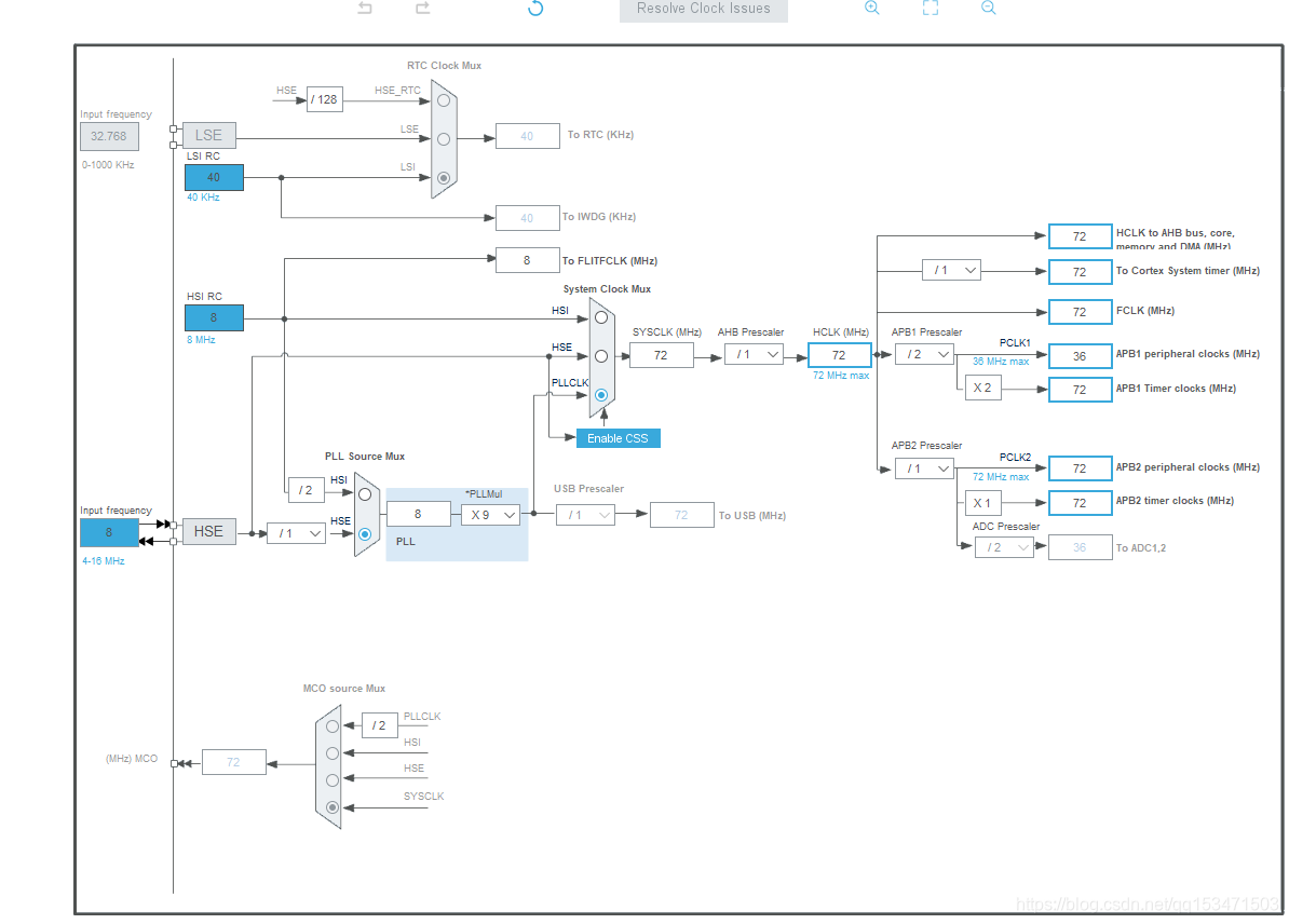 首先使用STM32CUBEMX生成STM32的基础工程,配置时钟到72M主频: