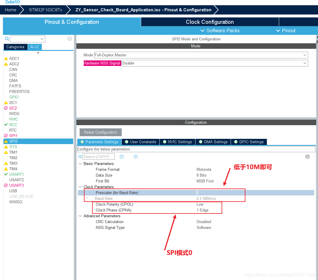 配置SPI前,首先查看WK2124的芯片手册,手册里面说明了WK2124的SPI最高支持到10M并且使用SPI模式0,SPI的模式0就是时钟空闲电平为低电平且在第一个时钟延采样:  所以STM32CUBEMX需要这样配置:  IO配置: