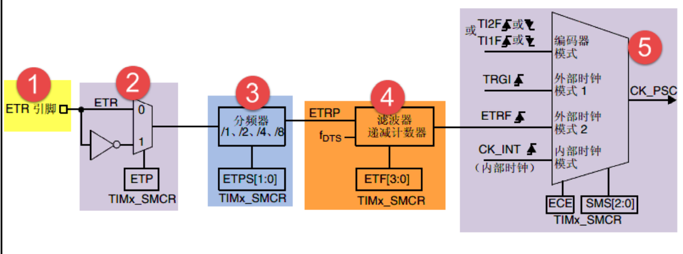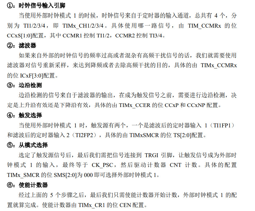 1.时钟源  1.内部时钟 内部时钟 CK_INT 即来自于芯片内部,等于 72M,一般情况下,我们都是使用内部时钟。当从模式控制寄存器 TIMx_SMCR 的 SMS 位等于 000 时,则使用内部时钟。 2.外部时钟模式一   2.外部时钟模式二   3.内部触发输入(了解) 2.时基    3.输入捕获