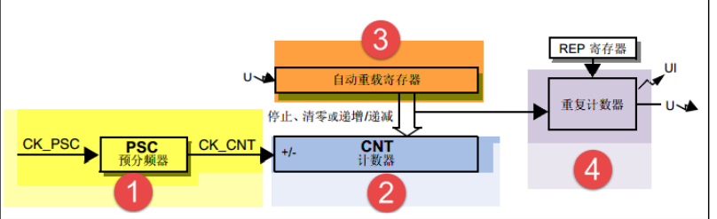 4.输出比较(输出PWM)  比较寄存器 当计数器 CNT 的值跟比较寄存器 CCR 的值相等的时候,输出参考信号 OCxREF 的信号的极性就会改变,其中 OCxREF=1(高电平)称之为有效电平,OCxREF=0(低电平)称之为无效电平,并且会产生比较中断 CCxI,相应的标志位 CCxIF(SR 寄存器中)会置位。然后 OCxREF 再经过一系列的控制之后就成为真正的输出信号 OCx/OCxN。
