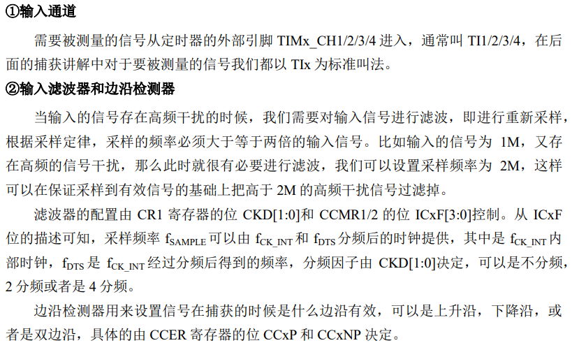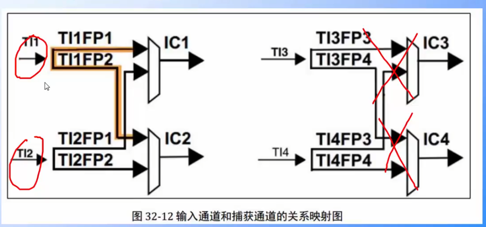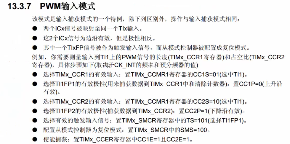 使用PWM输入捕获,一个输入通道会占用两个捕获通道,一个(进行脉宽的测量,一个进行周期的测量。PWM输入捕获只能使用CH1和CH2。 在直连模式下,选择TI1FP1为触发信号进行周期的测量,那么TI1FP2自动进入IC2进行脉宽的测量;在非直连模式下,选择TI1FP2为触发信号进入IC2进行周期的测量,那么TI1FP2自动进入IC1进行脉宽的测量;
