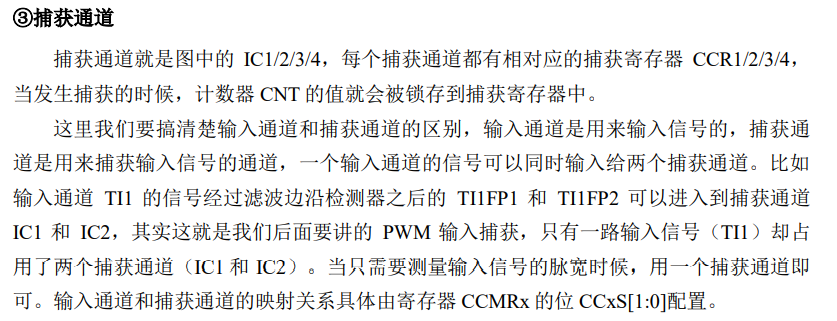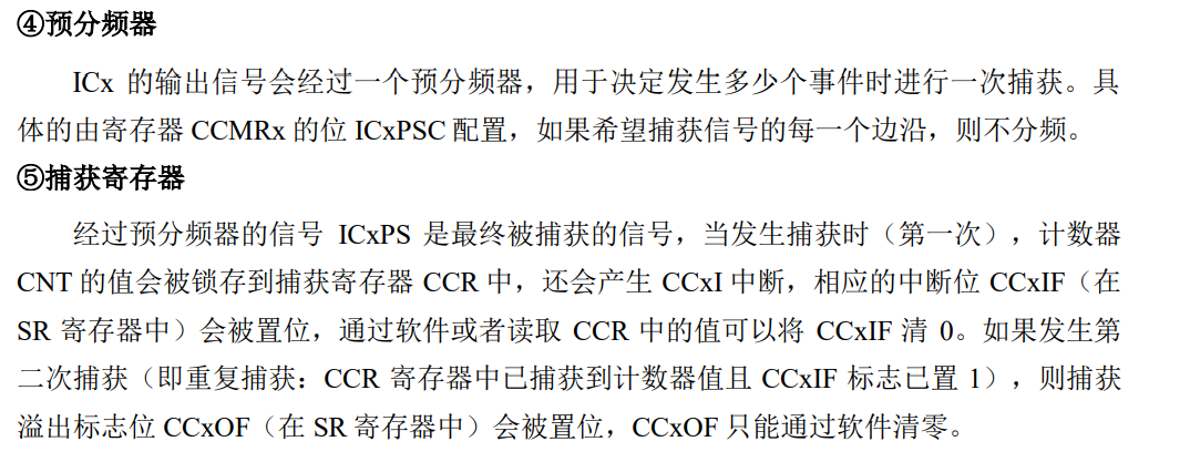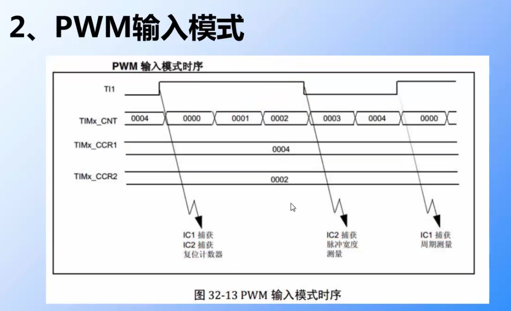 应用:  当第一次捕获到上升沿,进入中断将CNT的值清零,那么锁存到CCR的值也就为0,若此时改变捕获边沿为下降沿,那么第二次进入中断的CCR值就是测量脉宽的;若此时不改变捕获边沿,那么第二次进入中断的CCR值就是测量周期的。