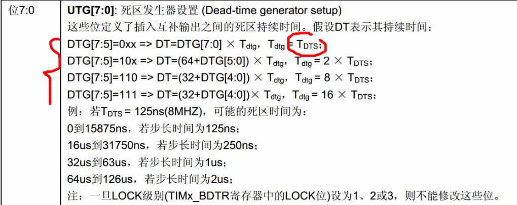 在生成的参考波形 OCxREF 的基础上,可以插入死区时间,用于生成两路互补的输出 信号 OCx 和 OCxN,死区时间的大小具体由 BDTR 寄存器的位 DTG[7:0]配置。死区时间 的大小必须根据与输出信号相连接的器件及其特性来调整。