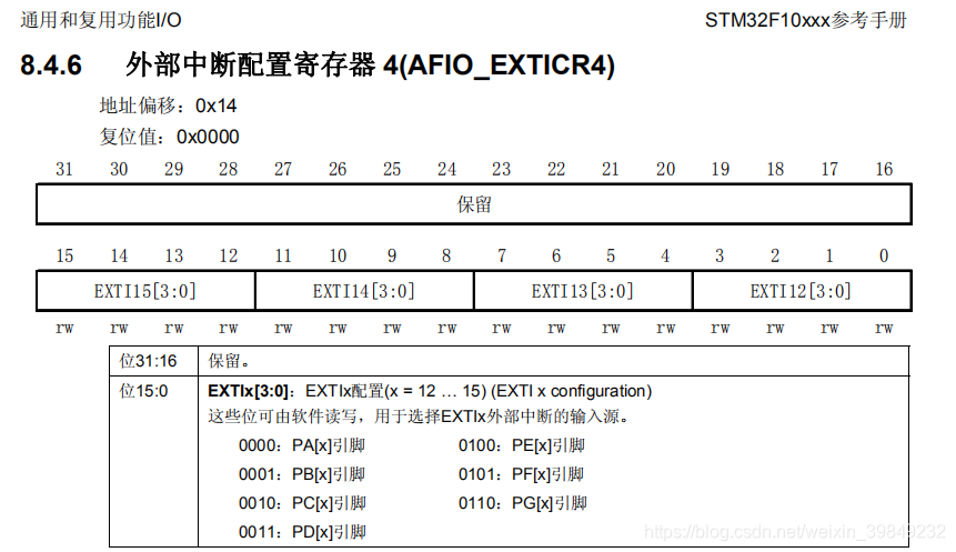 每个GPIO都有16个IO口,每个外部中断配置寄存器只能配置4个IO口,所以16个IO口分为四组
