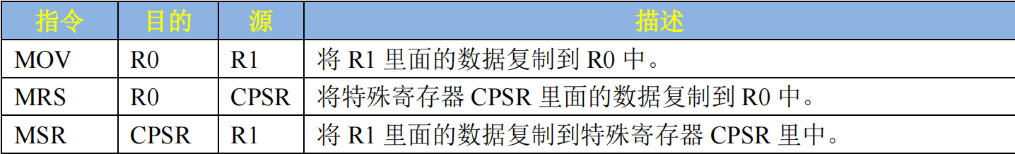 MSR CPSR, R0 @将 R0 中的数据复制到 CPSR 中,即 CPSR=R0