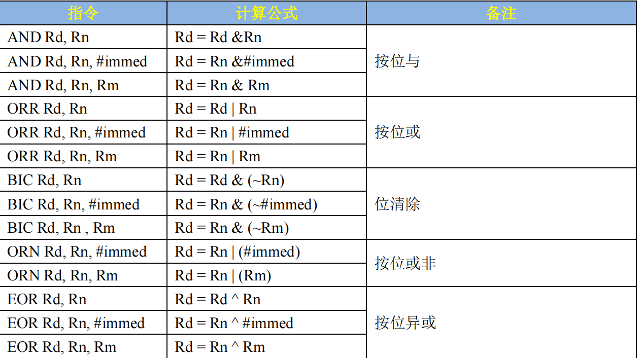 逻辑运算符。使用汇编语言的时候也可以使用逻辑运算指令,常用的运算指令用法如下表所示: