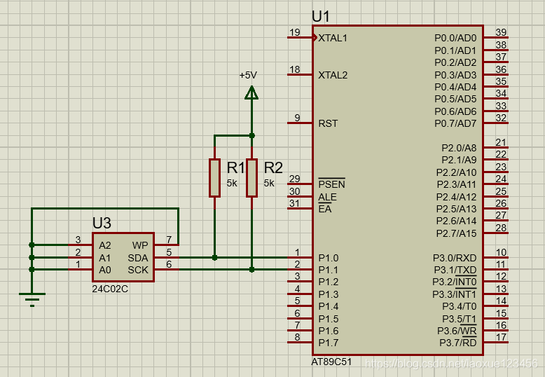 本仿真案例是用51单片机和存储芯片24C02C进行。所要实现的功能是在芯片的一个位写入数据,然后从该位读取数据,并写入另外一个位上。