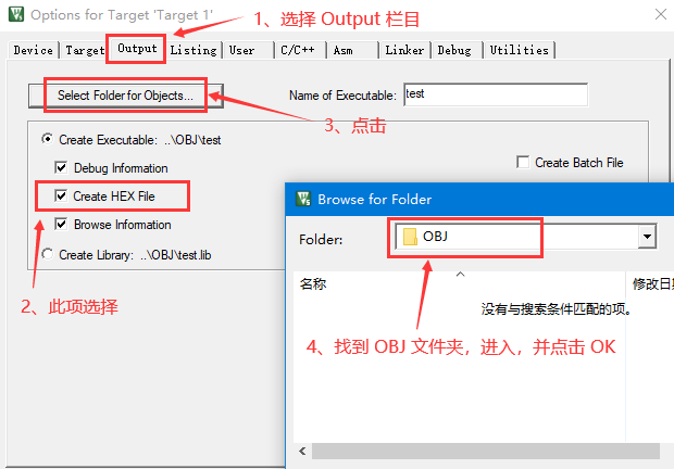选择Output栏目,勾选Creat HEX File,点击Select Folder for Objects,找到OBJ文件夹,点击OK,如图:  选择Listing栏目,点击Select Folder for Listing,找到OBJ文件夹,点击OK,如图:  点击OK,回到主界面
