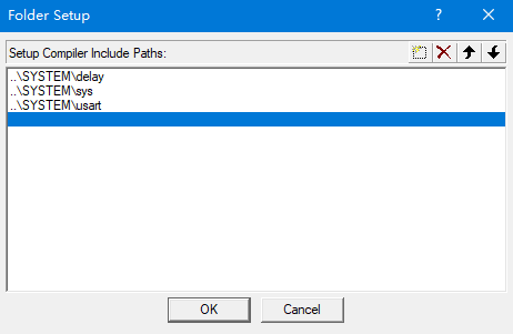点击Include Paths的···,在弹出的对话框中加入SYSTEM文件夹下的三个文件夹的名字,把这几个路径都加进去(此操作即加入编译器的头文件包含路径),如图:  点击OK,再点击OK